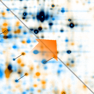 After the warping, the dual channel image gives valuable insight for comparing the spot patterns qualitatively. Black means that spots have roughly the same intensity on both images. Blue means a spot is much stronger on gel A, orange means it is much stronger on gel B.