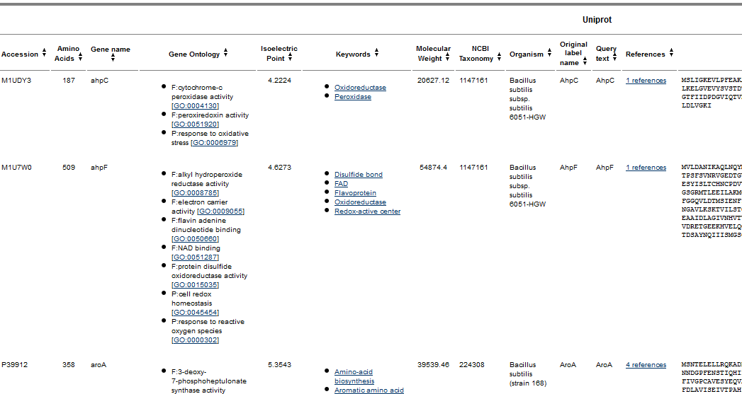 The label report lists the data which has been imported from web based ressources like UniProt or similar data bases. For known protein names you can employ DECODON Scouts to attach this additional data as label data to the respective spots and then show all labels in this report. Example