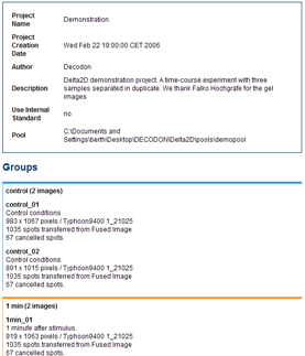GasPedal's interactive reports make it easy to present and summarize your experimental setup, relevant spots, and quantitative data. They are based on HTML so you can put them on the web easily. The reports are shown in your web browser so you can copy all or part of a report into your favorite word processor or presentation program. All reports are interactive. For example, clicking on a dual channel image in the project report will open the corresponding gel image pair in GasPedal. All reports can be accessed via the Reports menu.