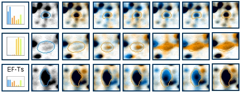 The spot quantities report shows spot profiles numerically, together with group-wise ratios and t-Test values. For including them in the report, mark or select spots of interest by marking or selcting them on a certain image. This report is well-suited for documenting a set of relevant spots, and for further statistical analysis. Example